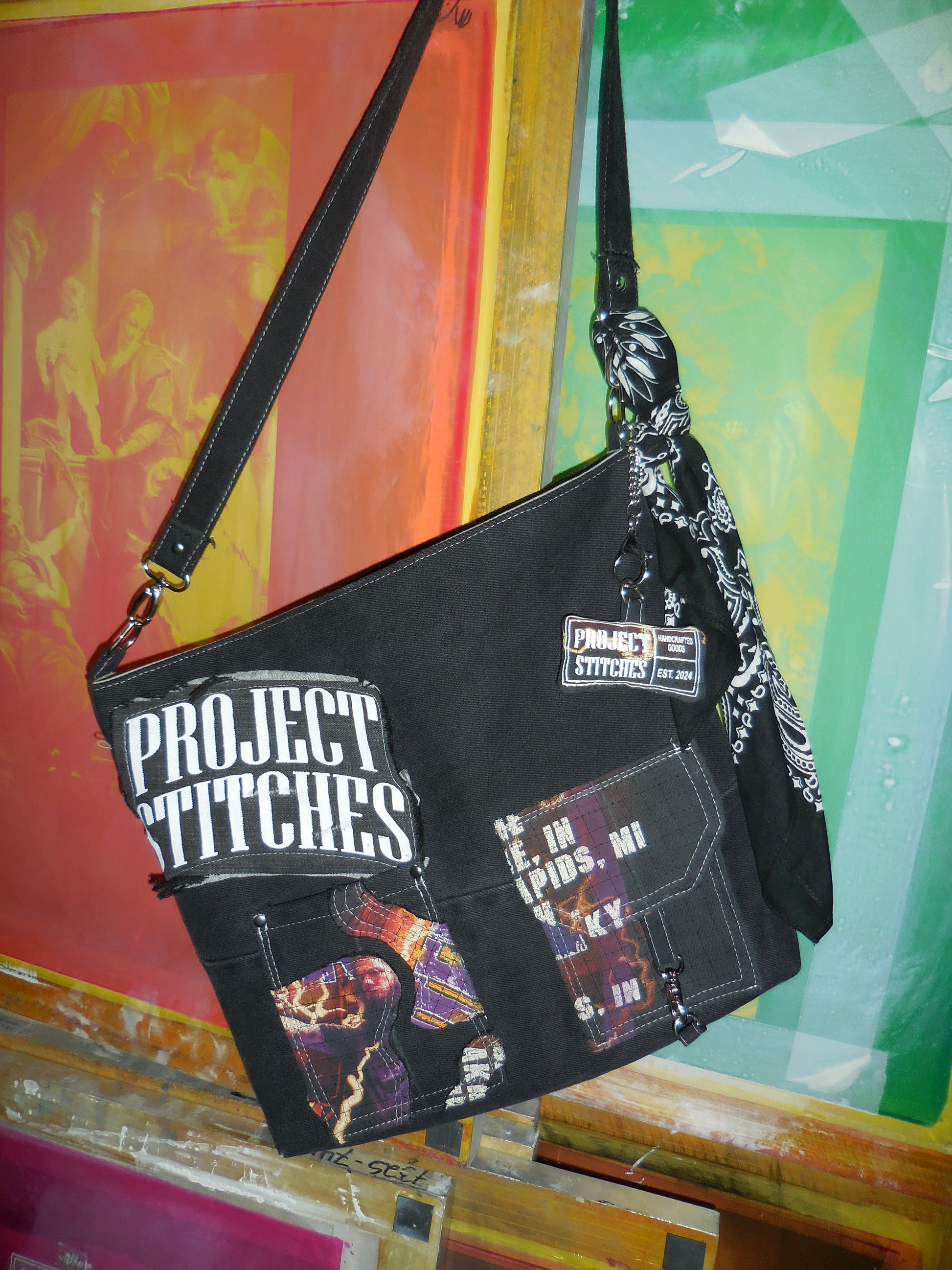Shoulder style bag includes two front pockets made from scrap denim and a vintage tee. One pocket has a hook enclosed flap and the other pocket comes flapless. Bandana and charm included.
